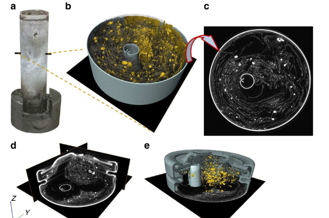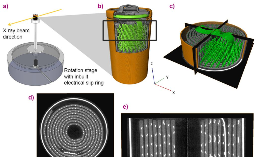 圖6是18650 電池掃描結果和表征。d和e是掃描得到的灰度圖,集流體是金屬,所以吸收能力強,呈現(xiàn)亮色,陰極是鋰化合物,包著集流器,陽極是碳,由于碳吸收能力太弱,和金屬化合物一起掃描,幾乎是透明的,和空氣差不多。通過對不同灰度的組分進行分割和篩選,可以把各個組分單獨隔離表征。比如b,c中綠色部分是集流體,咖啡色的是金屬外殼??梢院苋菀椎玫郊黧w的體積,面積,還有電極材料的體積,面積等等。