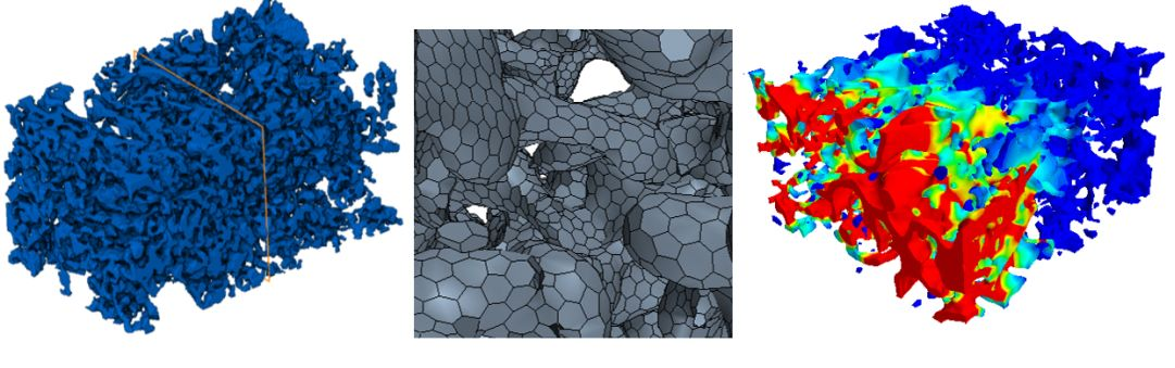 圖13左側是固體燃料電池陽極內部孔道結構的3D重構圖,通過對它進行網格化,可以進行氣體傳質的模擬以及熱學模擬,從而可以提取一些結構參數(shù),比如孔道扭曲度tortuosity,緊縮度 constrictivity 等等。左下角的圖能看到熱流流線上有紅色的高速區(qū)域,代表著局部孔道過小,可能會造成濃差極化,是可以進行下一步優(yōu)化的方向。