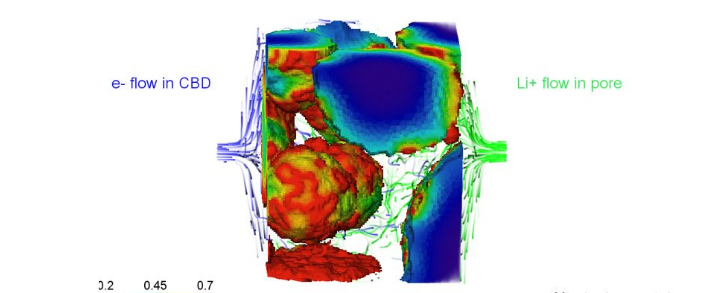 圖14左上是鋰電NMC陰極顆粒的3D 成像,通過對實體進行網格劃分,我們可以進行一個多物理場模擬(鋰離子,電子流動,電勢場,濃度場),設置適當?shù)剡吔鐥l件得到陰極顆粒內部嵌Li隨時間的關系,也可以進行局部電流密度和材料結構之間關系的研究。舉個例子,讀者完全可以做出幾種不同的NMC電極,不同的孔隙率,不同的活性材料配比,通過進行三維建模,看到顆粒大小和嵌入Li的濃度之間的關系,或者孔隙率,孔道大小和倍率性能之間的關系,得出參數(shù)化結論,并且能夠進行性能預測。這些結果對做出高安全性,高倍率性能,高循環(huán)性能和高能量密度的電極材料有非常重要的指導意義。